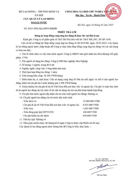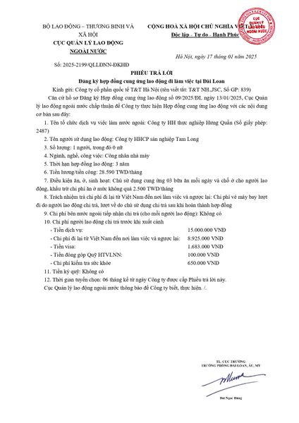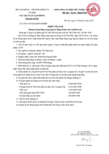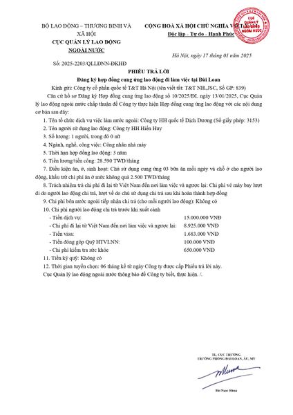 Phiếu trả lời của Cục quản lý lao động ngoài nước- Thị trường Đài Loan